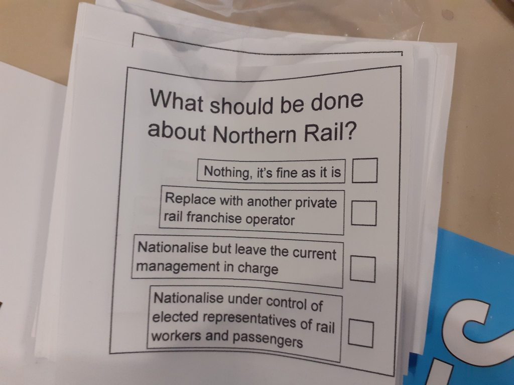 We held a mock ballot on what should be done about the Northern Rail situation. There were four options on the ballot paper – leave it as it is, hand the franchise over to another private rail operator, nationalise the service but keep the same management, or nationalise the service under the democratic control of workers and service users.