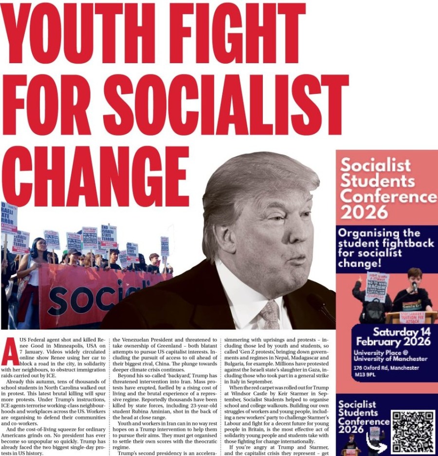 When the red carpet was rolled out for Trump at Windsor Castle by Keir Starmer in September, Socialist Students helped to organise school and college walkouts. Building our own struggles of workers and young people, including a new workers’ party to challenge Starmer’s Labour and fight for a decent future for young people in Britain, is the most effective act of solidarity young people and students take with those fighting for change internationally.