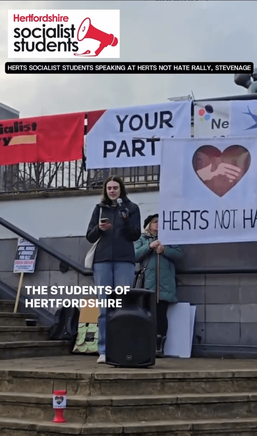 “Students of Hertfordshire and the workers of Hertfordshire, fighting together against austerity, war, and all forms of oppression.