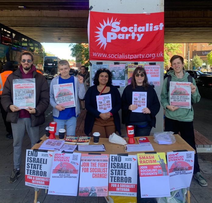School and college students have organised walkouts and protests in solidarity with the Palestinians. Towards the end of last term, student encampments were organised up and down the country, exposing universities’ links to arms companies and banks. Socialist Students members were involved with many of these.