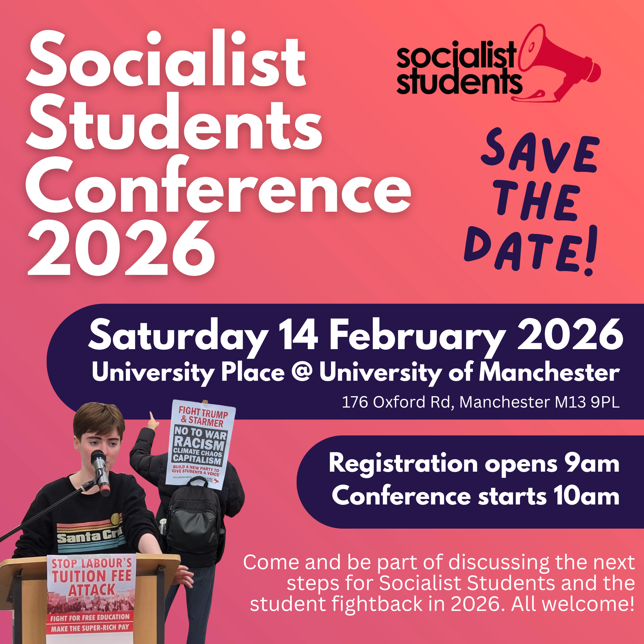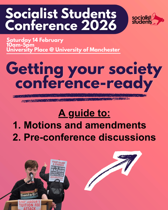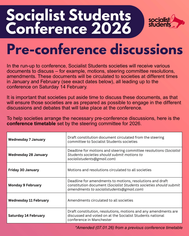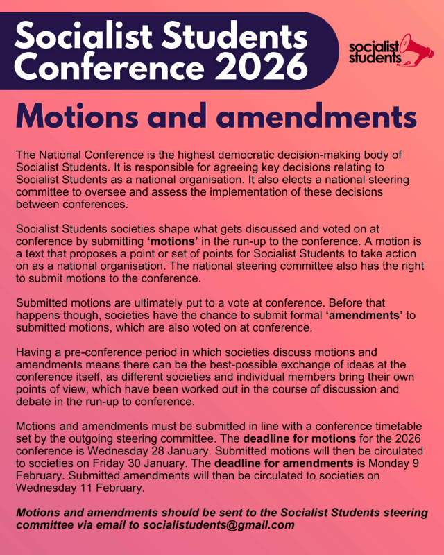 | Wednesday 28 January | Deadline for motions and steering committee resolutions (Socialist Students societies should submit motions to socialistudents@gmail.com) |