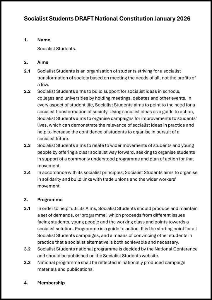 | Wednesday 7 January | Draft constitution document circulated from the steering committee to Socialist Students societies |