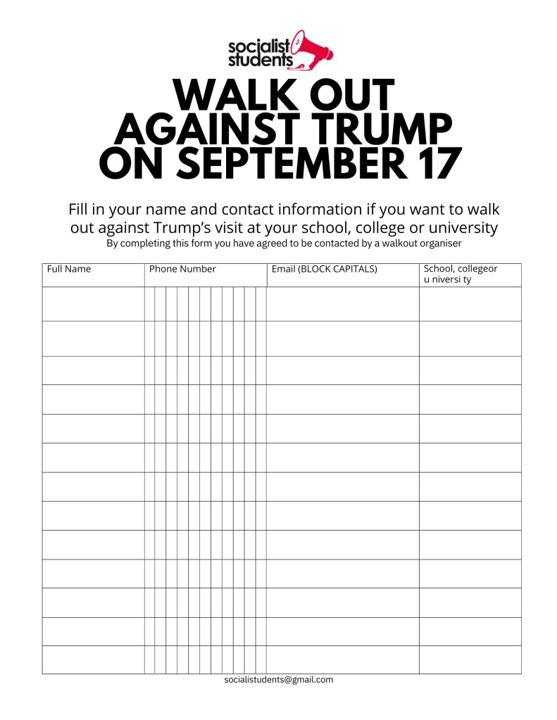 Get Trump walkout material! Use the form at the bottom of the page to order some of the leaflet below – or click on the material to access PDFs to print at home. Leaflet Poster Sign-up sheet Order Trump walkout material from Socialist Students Go backYour message has been sent Name(required) Warning Email(required) Warning Phone Warning Address (required) Warning Leaflet quantity(required) Warning Message Warning Warning! Contact UsSubmitting form Δ Share this: Click to share on X (Opens in new window) X Click to share on Facebook (Opens in new window) Facebook Like Loading...
